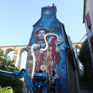 Premier artiste du MX ARTS TOUR 2023 c'est ZAG créateur du festival et artiste urbain. Un superbe hommage à l'artiste symboliste Gustav Klimt, finalisé à la feuille d'or. C'est tout simplement brillant ! 🌞 Venelle de la Roche, Morlaix 📍👀